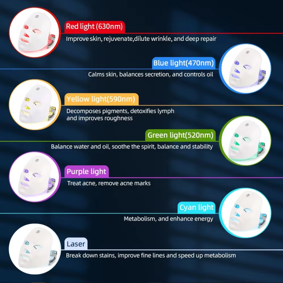 Red for fine lines/firmness, Blue for blemishes, Yellow for redness, Green for dark spots/uneven tone. Purple, Cyan, and White blend benefits for overall clarity and radiance.